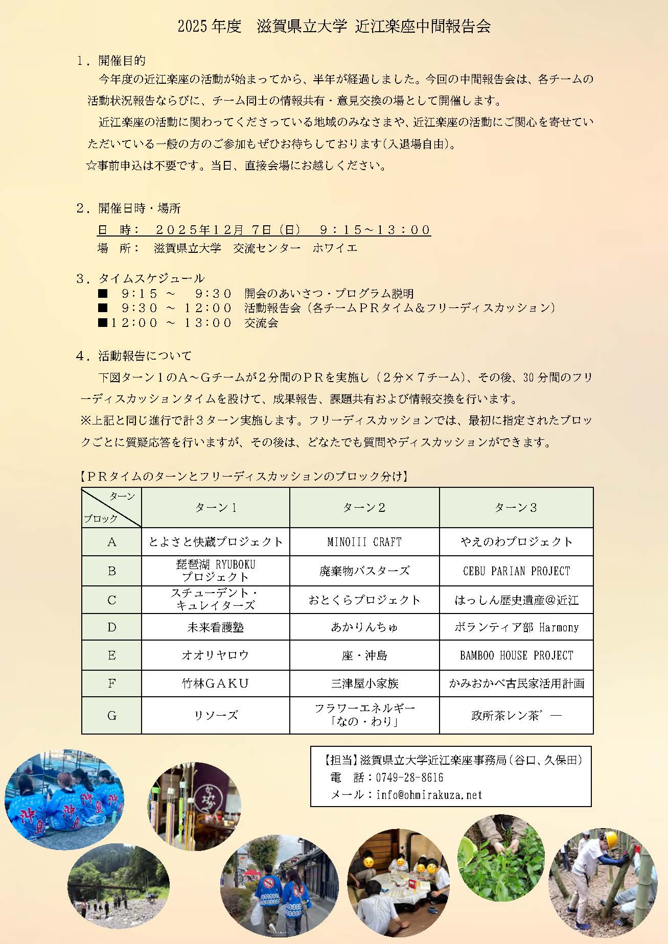 2025年度近江楽座「中間報告会」を開催します 2025年12月2日(火) 更新 2025年度の近江楽座の活動が始まり半年が経ちました。 中間報告会は、今年度採択された21 チームが日頃の活動成果報告および情報・意見交換として開催します。近江楽座にご関心を寄せてくださるみなさまのお越しをお待ちしております。 ※事前申込不要です。 ▼詳しくは下記チラシ(PDF)をご覧ください。(クリックすると拡大されます)
